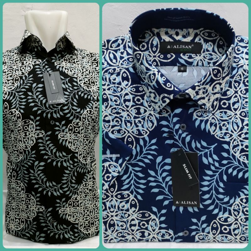 Name: Kemeja Batik Pria Alisan Pendek Slimfit Motif Daun Pohon Biru Hitam